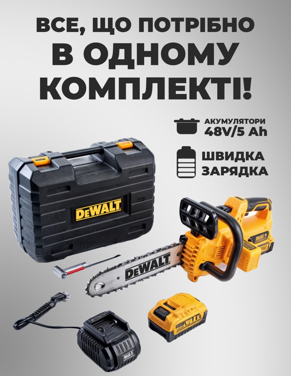 Купуючи акумуляторну пилку DeWalt, ви отримуєте готове рішення для будь-яких завдань з розпилювання деревини. Більше не потрібно шукати додаткові аксесуари чи чекати годинами на зарядку — ми подбали про ваш комфорт і безперервну роботу. Вам не доведеться витрачати час на підбір сумісних батарей або пошук зручної сумки для перенесення. Ви отримуєте збалансований набір, де кожен елемент ідеально підходить один до одного.